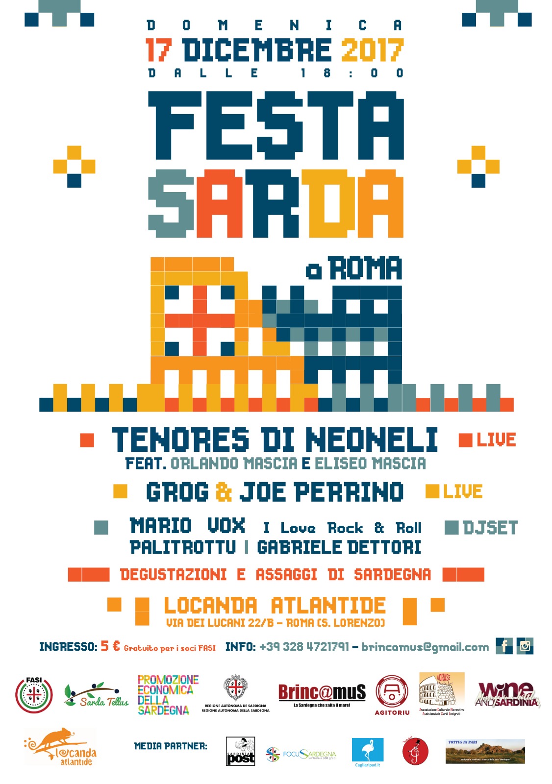 Per la città di Roma questo evento è stato pensato sia in quest’ottica, che come momento di aggregazione tra sardi, che grazie a questa occasione avranno l’opportunità di incontrarsi per un bicchiere di vino o mirto in prossimità delle festività natalizie, e per un saluto prima delle vacanze. Qui potranno godere dei momenti musicali e culturali adatti a tutti, con il canto a tenore, il rock e il dj set e con in più la possibilità di degustare prodotti tipici dell’Isola.